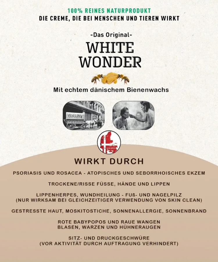 White Wonder ist eine vielseitige Natur-Salbe auf Basis echten dänischen Bienenwachses – entwickelt zur intensiven Pflege von gereizter Haut bei Ekzemen, Psoriasis, Neurodermitis, trockenen Füßen, Lippen oder Wundstellen. Sie zieht schnell ein, pflegt tief und lindert Juckreiz spürbar.