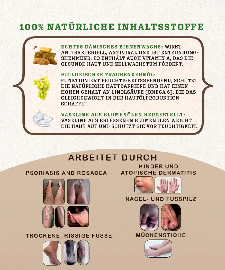Die Kombination aus natürlichem Bienenwachs und pflegenden Ölen unterstützt die Hautregeneration sichtbar und vermindert Irritationen, Trockenheit und Spannungsgefühle.